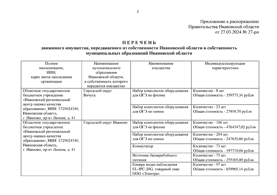 Распоряжение Правительства Ивановской области от 27.03.2024 N 27-рп "О передаче движимого имущества из собственности Ивановской области в собственность муниципальных образований Ивановской области"