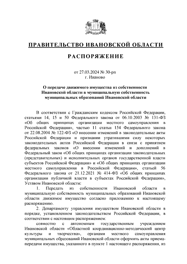 Распоряжение Правительства Ивановской области от 27.03.2024 N 30-рп "О передаче движимого имущества из собственности Ивановской области в муниципальную собственность муниципальных образований Ивановской области"