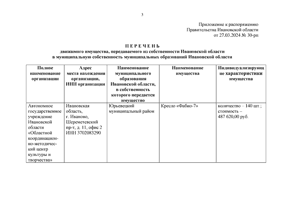 Распоряжение Правительства Ивановской области от 27.03.2024 N 30-рп "О передаче движимого имущества из собственности Ивановской области в муниципальную собственность муниципальных образований Ивановской области"