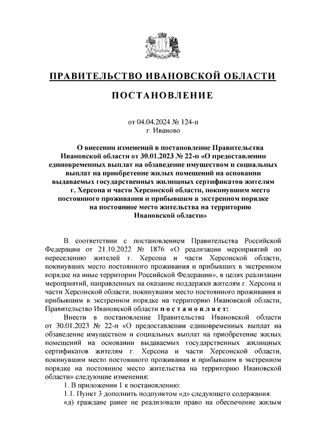 Постановление Правительства Ивановской области от 04.04.2024 N 124-п "О внесении изменений в постановление Правительства Ивановской области от 30.01.2023 N 22-п "О предоставлении единовременных выплат на обзаведение имуществом и социальных выплат на приобретение жилых помещений на основании выдаваемых государственных жилищных сертификатов жителям г. Херсона и части Херсонской области, покинувшим место постоянного проживания и прибывшим в экстренном порядке на постоянное место жительства на территорию Ивановской области"
