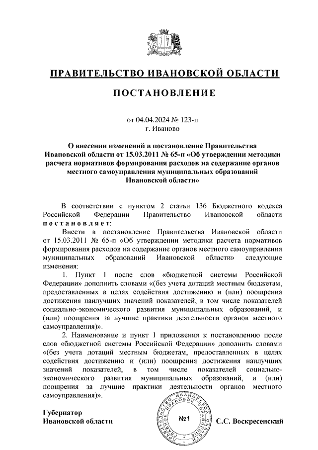 Постановление Правительства Ивановской области от 04.04.2024 N 123-п "О внесении изменений в постановление Правительства Ивановской области от 15.03.2011 N 65-п "Об утверждении методики расчета нормативов формирования расходов на содержание органов местного самоуправления муниципальных образований Ивановской области"