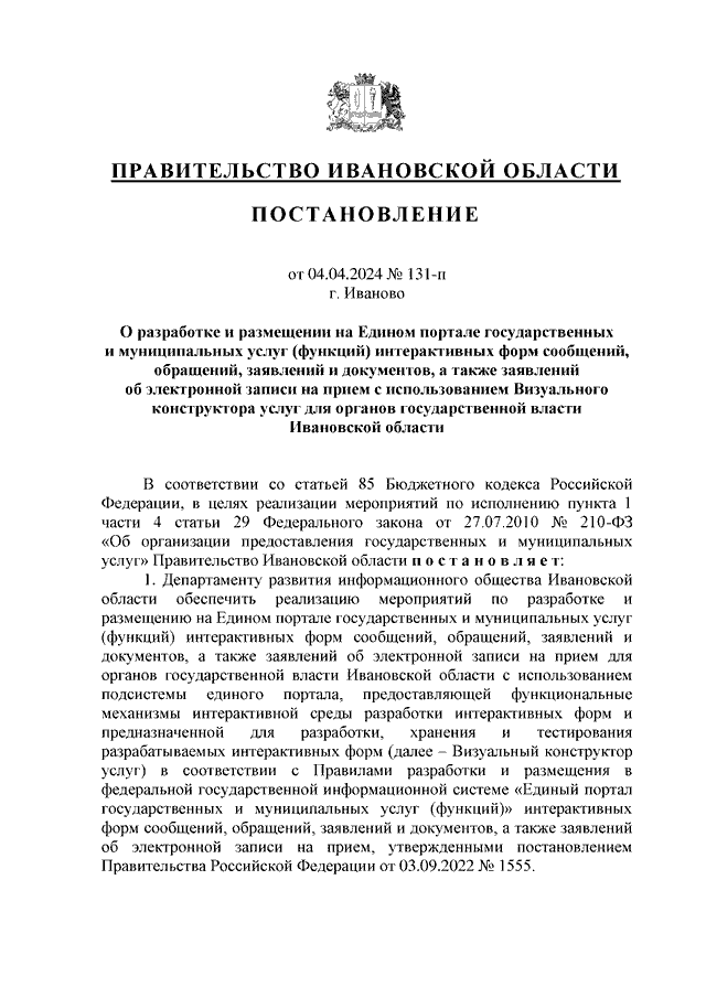 Постановление Правительства Ивановской области от 04.04.2024 N 131-п "О разработке и размещении на Едином портале государственных и муниципальных услуг (функций) интерактивных форм сообщений, обращений, заявлений и документов, а также заявлений об электронной записи на прием с использованием Визуального конструктора услуг для органов государственной власти Ивановской области"