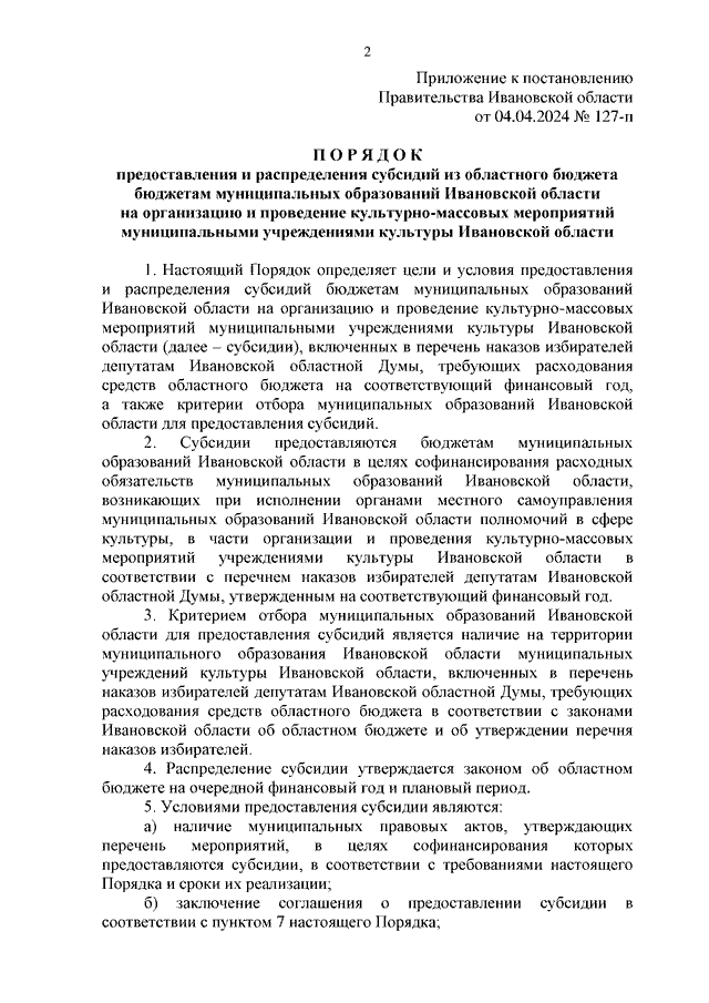 Постановление Правительства Ивановской области от 04.04.2024 N 127-п "Об утверждении Порядка предоставления и распределения субсидий из областного бюджета бюджетам муниципальных образований Ивановской области на организацию и проведение культурно-массовых мероприятий муниципальными учреждениями культуры Ивановской области"