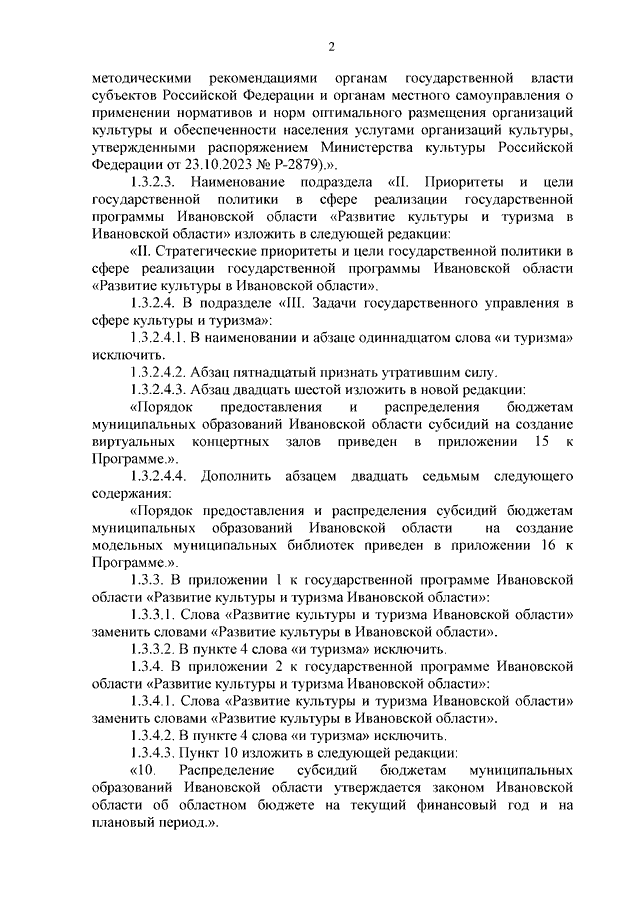 Постановление Правительства Ивановской области от 04.04.2024 N 133-п "О внесении изменений в постановление Правительства Ивановской области от 06.12.2017 N 455-п "Об утверждении государственной программы Ивановской области "Развитие культуры и туризма в Ивановской области" (вместе с "Перечнем объектов капитального строительства, мероприятий (укрупненных инвестиционных проектов), объектов недвижимости, реализуемых в рамках государственной программы "Развитие культуры в Ивановской области", "Порядком предоставления и распределения бюджетам муниципальных образований Ивановской области субсидий на создание виртуальных концертных залов", "Порядком предоставления и распределения субсидий бюджетам муниципальных образований Ивановской области на создание модельных муниципальных библиотек")