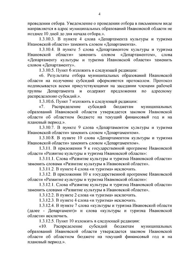Постановление Правительства Ивановской области от 04.04.2024 N 133-п "О внесении изменений в постановление Правительства Ивановской области от 06.12.2017 N 455-п "Об утверждении государственной программы Ивановской области "Развитие культуры и туризма в Ивановской области" (вместе с "Перечнем объектов капитального строительства, мероприятий (укрупненных инвестиционных проектов), объектов недвижимости, реализуемых в рамках государственной программы "Развитие культуры в Ивановской области", "Порядком предоставления и распределения бюджетам муниципальных образований Ивановской области субсидий на создание виртуальных концертных залов", "Порядком предоставления и распределения субсидий бюджетам муниципальных образований Ивановской области на создание модельных муниципальных библиотек")