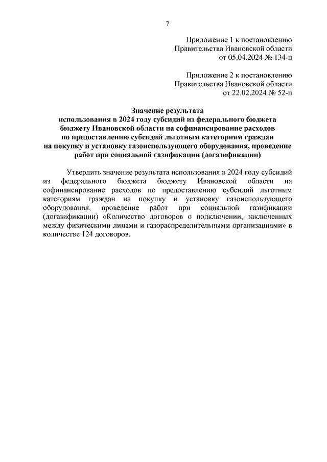 Постановление Правительства Ивановской области от 05.04.2024 N 134-п "О внесении изменений в постановление Правительства Ивановской области от 22.02.2024 N 52-п "О дополнительной мере социальной поддержки граждан в виде предоставления субсидий льготным категориям граждан на покупку и установку газоиспользующего оборудования, проведение работ внутри границ их земельных участков в рамках реализации мероприятий по осуществлению подключения (технологического присоединения) газоиспользующего оборудования и объектов капитального строительства к газораспределительным сетям при догазификации в Ивановской области в 2024 году"
