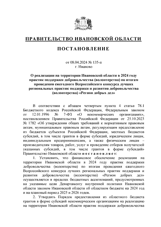 Постановление Правительства Ивановской области от 08.04.2024 N 135-п "О реализации на территории Ивановской области в 2024 году практик поддержки добровольчества (волонтерства) по итогам проведения ежегодного Всероссийского конкурса лучших региональных практик поддержки и развития добровольчества (волонтерства) "Регион добрых дел" (вместе с "Порядком предоставления из областного бюджета грантов в форме субсидий некоммерческим организациям на реализацию на территории Ивановской области практик поддержки добровольчества (волонтерства) по итогам проведения ежегодного Всероссийского конкурса лучших региональных практик поддержки и развития добровольчества (волонтерства) "Регион добрых дел")