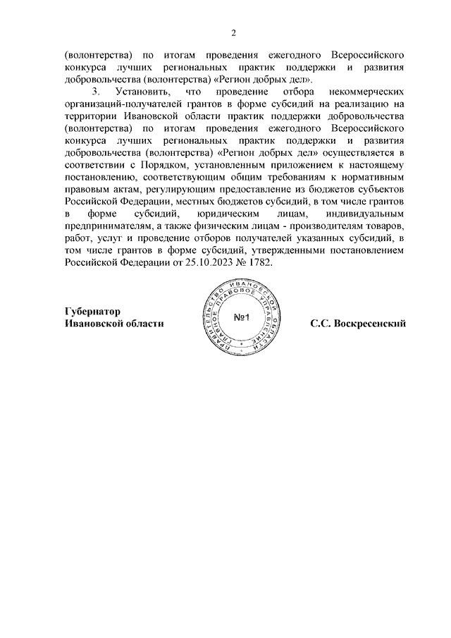 Постановление Правительства Ивановской области от 08.04.2024 N 135-п "О реализации на территории Ивановской области в 2024 году практик поддержки добровольчества (волонтерства) по итогам проведения ежегодного Всероссийского конкурса лучших региональных практик поддержки и развития добровольчества (волонтерства) "Регион добрых дел" (вместе с "Порядком предоставления из областного бюджета грантов в форме субсидий некоммерческим организациям на реализацию на территории Ивановской области практик поддержки добровольчества (волонтерства) по итогам проведения ежегодного Всероссийского конкурса лучших региональных практик поддержки и развития добровольчества (волонтерства) "Регион добрых дел")