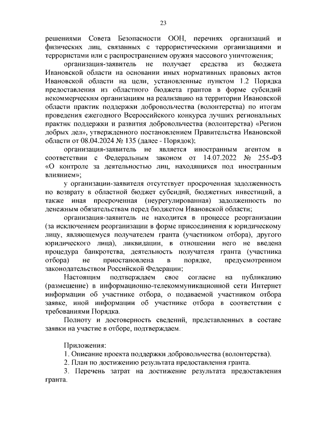Постановление Правительства Ивановской области от 08.04.2024 N 135-п "О реализации на территории Ивановской области в 2024 году практик поддержки добровольчества (волонтерства) по итогам проведения ежегодного Всероссийского конкурса лучших региональных практик поддержки и развития добровольчества (волонтерства) "Регион добрых дел" (вместе с "Порядком предоставления из областного бюджета грантов в форме субсидий некоммерческим организациям на реализацию на территории Ивановской области практик поддержки добровольчества (волонтерства) по итогам проведения ежегодного Всероссийского конкурса лучших региональных практик поддержки и развития добровольчества (волонтерства) "Регион добрых дел")