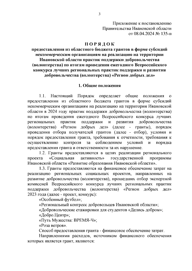 Постановление Правительства Ивановской области от 08.04.2024 N 135-п "О реализации на территории Ивановской области в 2024 году практик поддержки добровольчества (волонтерства) по итогам проведения ежегодного Всероссийского конкурса лучших региональных практик поддержки и развития добровольчества (волонтерства) "Регион добрых дел" (вместе с "Порядком предоставления из областного бюджета грантов в форме субсидий некоммерческим организациям на реализацию на территории Ивановской области практик поддержки добровольчества (волонтерства) по итогам проведения ежегодного Всероссийского конкурса лучших региональных практик поддержки и развития добровольчества (волонтерства) "Регион добрых дел")