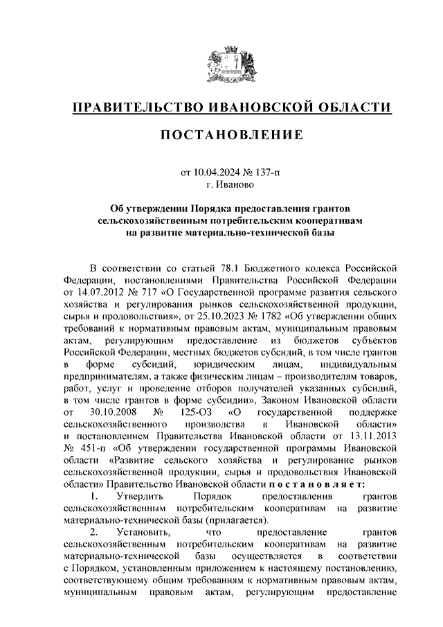 Постановление Правительства Ивановской области от 10.04.2024 N 137-п "Об утверждении Порядка предоставления грантов сельскохозяйственным потребительским кооперативам на развитие материально-технической базы"