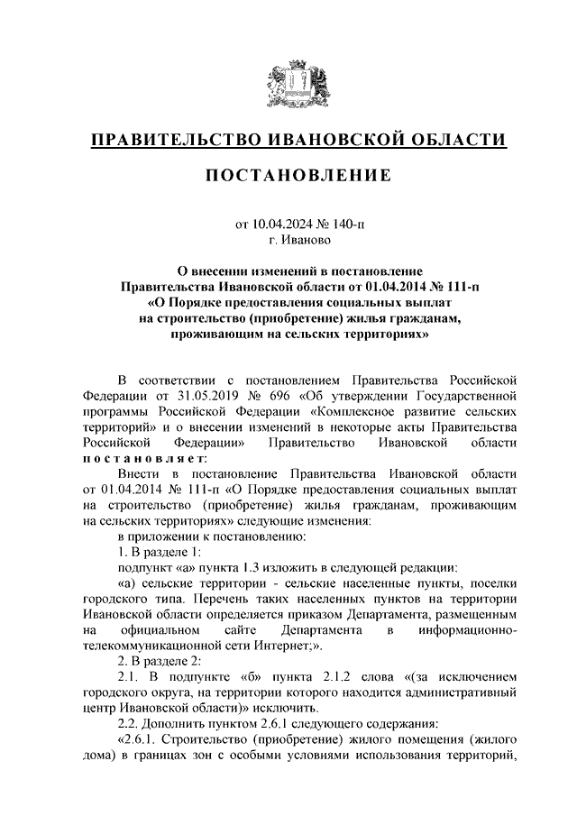 Постановление Правительства Ивановской области от 10.04.2024 N 140-п "О внесении изменений в постановление Правительства Ивановской области от 01.04.2014 N 111-п "О Порядке предоставления социальных выплат на строительство (приобретение) жилья гражданам, проживающим на сельских территориях"