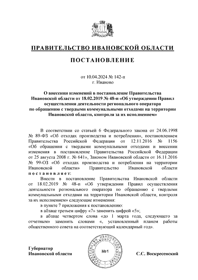 Постановление Правительства Ивановской области от 10.04.2024 N 142-п "О внесении изменений в постановление Правительства Ивановской области от 18.02.2019 N 48-п "Об утверждении Правил осуществления деятельности регионального оператора по обращению с твердыми коммунальными отходами на территории Ивановской области, контроля за их исполнением"