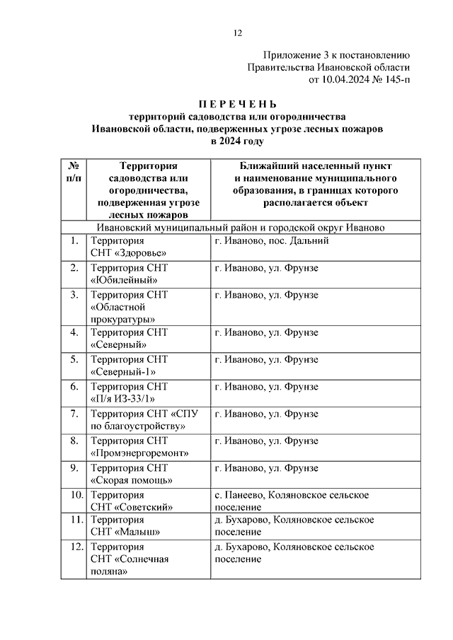 Постановление Правительства Ивановской области от 10.04.2024 N 145-п "Об утверждении перечня населенных пунктов Ивановской области, подверженных угрозе лесных пожаров и других ландшафтных (природных) пожаров в 2024 году, перечней территорий организаций отдыха детей и их оздоровления Ивановской области, территорий садоводства или огородничества Ивановской области, подверженных угрозе лесных пожаров в 2024 году, и начале пожароопасного сезона"