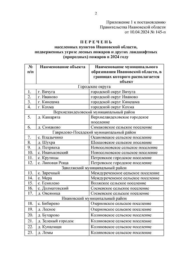Постановление Правительства Ивановской области от 10.04.2024 N 145-п "Об утверждении перечня населенных пунктов Ивановской области, подверженных угрозе лесных пожаров и других ландшафтных (природных) пожаров в 2024 году, перечней территорий организаций отдыха детей и их оздоровления Ивановской области, территорий садоводства или огородничества Ивановской области, подверженных угрозе лесных пожаров в 2024 году, и начале пожароопасного сезона"