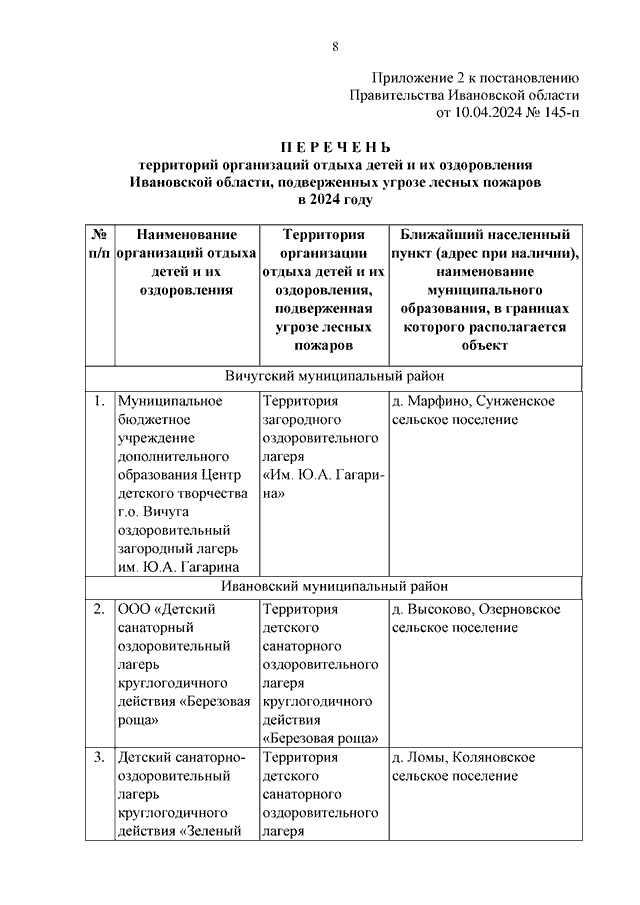 Постановление Правительства Ивановской области от 10.04.2024 N 145-п "Об утверждении перечня населенных пунктов Ивановской области, подверженных угрозе лесных пожаров и других ландшафтных (природных) пожаров в 2024 году, перечней территорий организаций отдыха детей и их оздоровления Ивановской области, территорий садоводства или огородничества Ивановской области, подверженных угрозе лесных пожаров в 2024 году, и начале пожароопасного сезона"