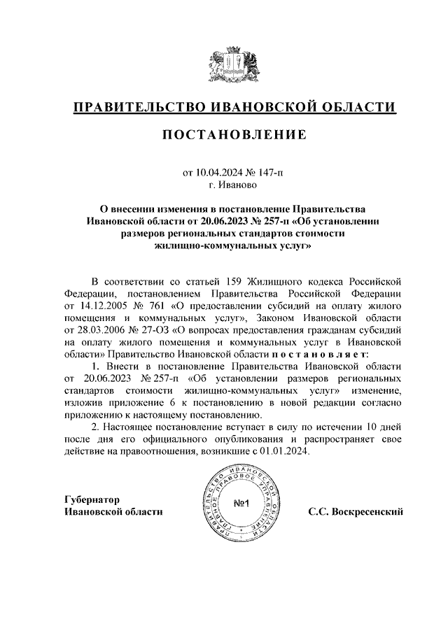Постановление Правительства Ивановской области от 10.04.2024 N 147-п "О внесении изменения в постановление Правительства Ивановской области от 20.06.2023 N 257-п "Об установлении размеров региональных стандартов стоимости жилищно-коммунальных услуг"