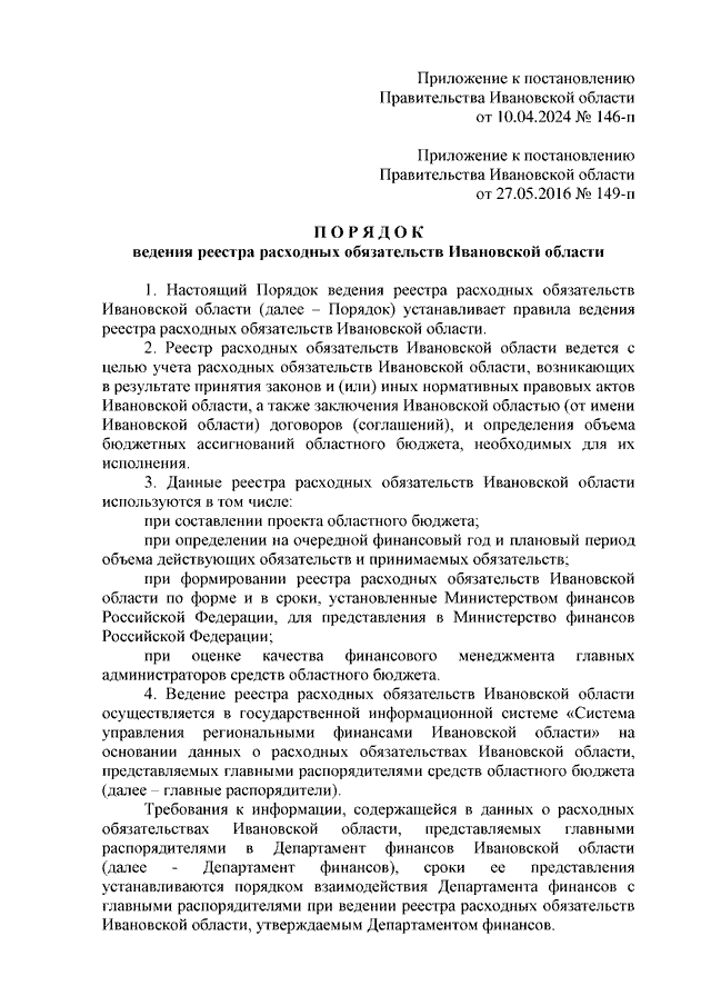 Постановление Правительства Ивановской области от 10.04.2024 N 146-п "О внесении изменения в постановление Правительства Ивановской области от 27.05.2016 N 149-п "Об утверждении Порядка ведения реестра расходных обязательств Ивановской области"