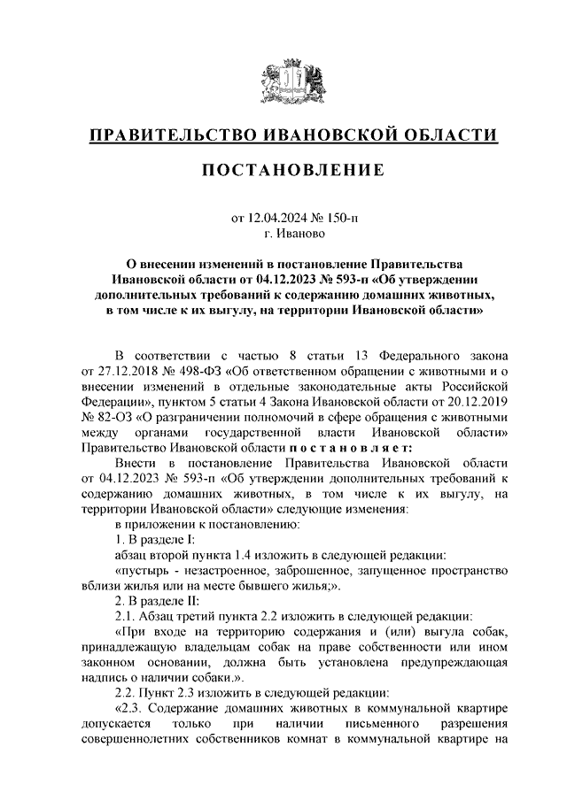 Постановление Правительства Ивановской области от 12.04.2024 N 150-п "О внесении изменений в постановление Правительства Ивановской области от 04.12.2023 N 593-п "Об утверждении дополнительных требований к содержанию домашних животных, в том числе к их выгулу, на территории Ивановской области"
