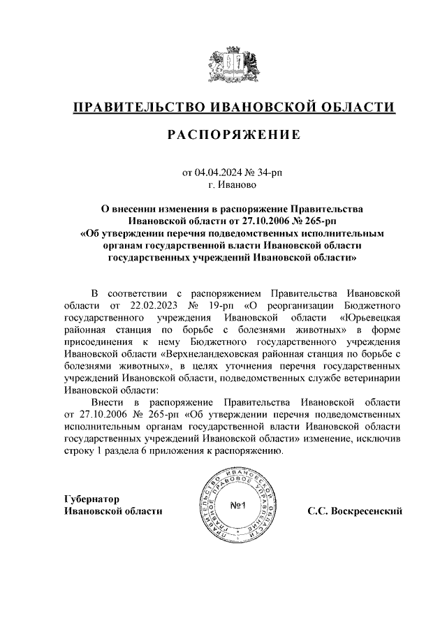 Распоряжение Правительства Ивановской области от 04.04.2024 N 34-рп "О внесении изменения в распоряжение Правительства Ивановской области от 27.10.2006 N 265-рп "Об утверждении перечня подведомственных исполнительным органам государственной власти Ивановской области государственных учреждений Ивановской области"