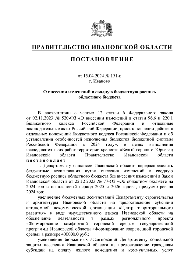 Постановление Правительства Ивановской области от 15.04.2024 N 151-п "О внесении изменений в сводную бюджетную роспись областного бюджета"