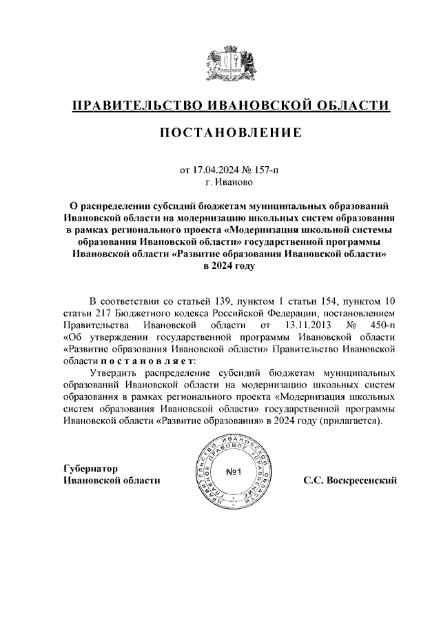 Постановление Правительства Ивановской области от 17.04.2024 N 157-п "О распределении субсидий бюджетам муниципальных образований Ивановской области на модернизацию школьных систем образования в рамках регионального проекта "Модернизация школьной системы образования Ивановской области" государственной программы Ивановской области "Развитие образования Ивановской области" в 2024 году"