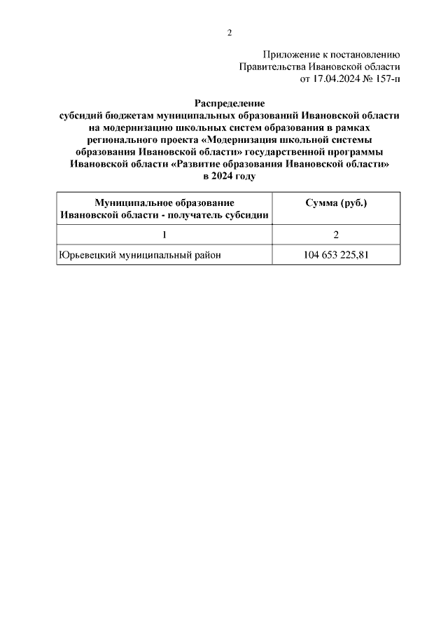 Постановление Правительства Ивановской области от 17.04.2024 N 157-п "О распределении субсидий бюджетам муниципальных образований Ивановской области на модернизацию школьных систем образования в рамках регионального проекта "Модернизация школьной системы образования Ивановской области" государственной программы Ивановской области "Развитие образования Ивановской области" в 2024 году"