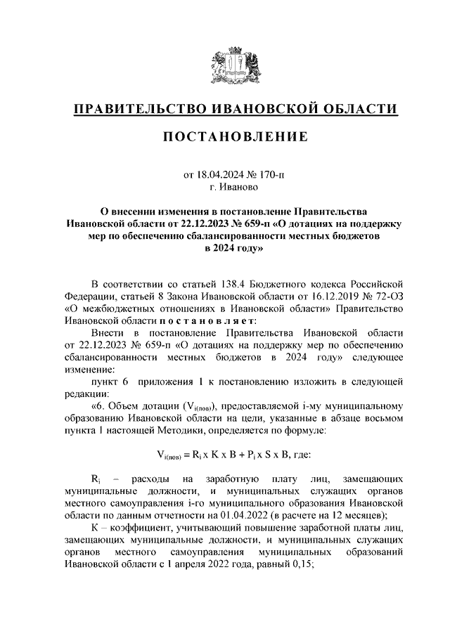 Постановление Правительства Ивановской области от 18.04.2024 N 170-п "О внесении изменения в постановление Правительства Ивановской области от 22.12.2023 N 659-п "О дотациях на поддержку мер по обеспечению сбалансированности местных бюджетов в 2024 году"