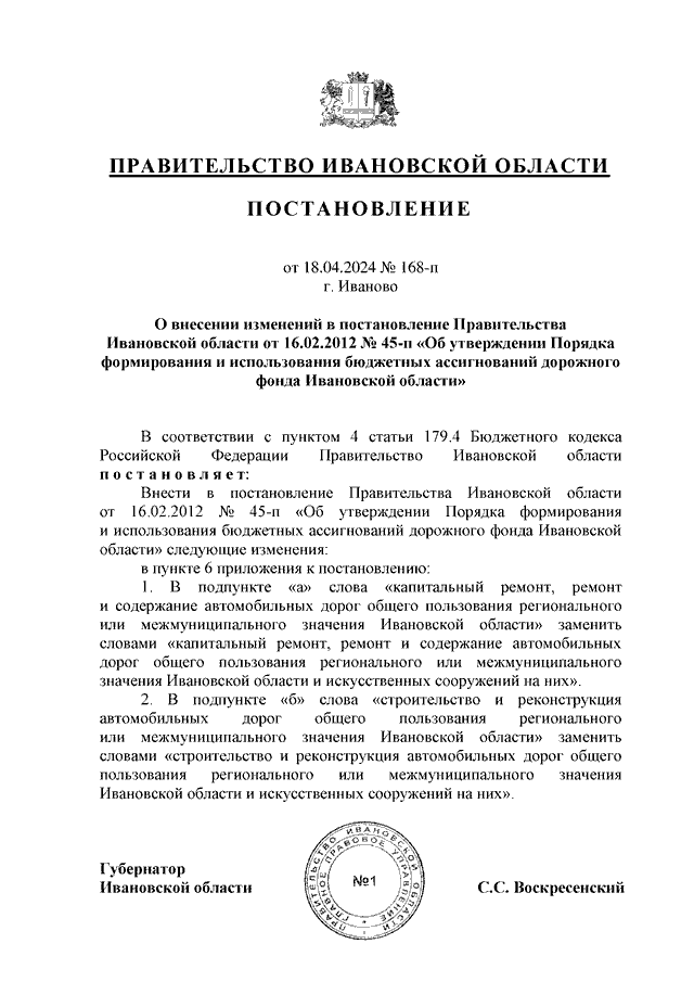 Постановление Правительства Ивановской области от 18.04.2024 N 168-п "О внесении изменений в постановление Правительства Ивановской области от 16.02.2012 N 45-п "Об утверждении Порядка формирования и использования бюджетных ассигнований дорожного фонда Ивановской области"