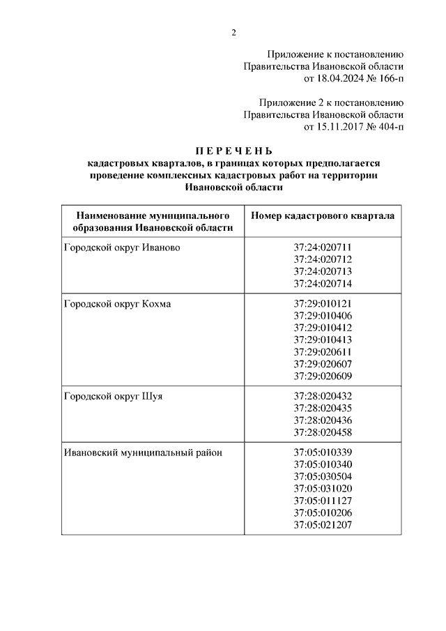 Постановление Правительства Ивановской области от 18.04.2024 N 166-п "О внесении изменений в постановление Правительства Ивановской области от 15.11.2017 N 404-п "О выполнении комплексных кадастровых работ на территории Ивановской области" (вместе с "Перечнем кадастровых кварталов, в границах которых предполагается проведение комплексных кадастровых работ на территории Ивановской области")