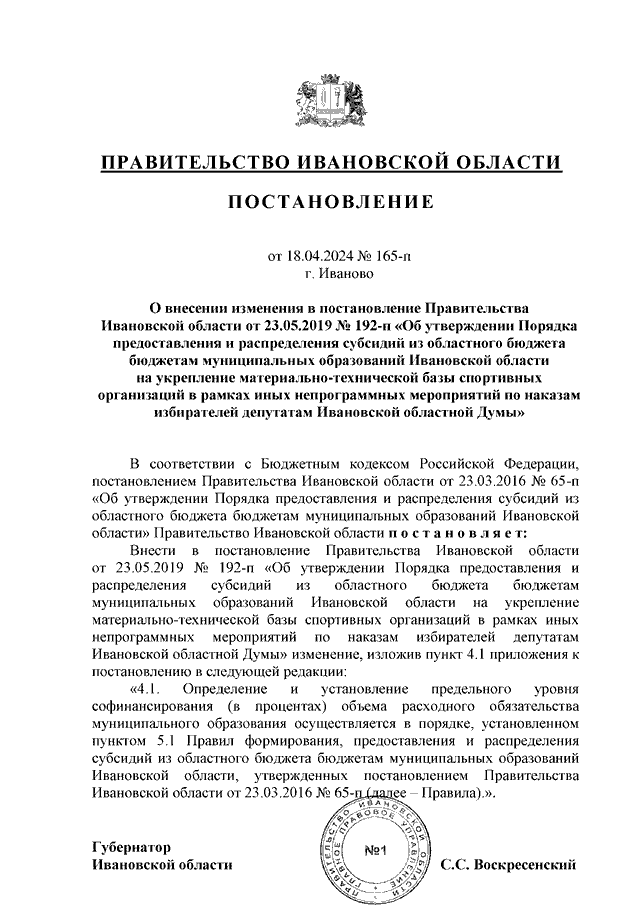 Постановление Правительства Ивановской области от 18.04.2024 N 165-п "О внесении изменения в постановление Правительства Ивановской области от 23.05.2019 N 192-п "Об утверждении Порядка предоставления и распределения субсидий из областного бюджета бюджетам муниципальных образований Ивановской области на укрепление материально-технической базы спортивных организаций в рамках иных непрограммных мероприятий по наказам избирателей депутатам Ивановской областной Думы"