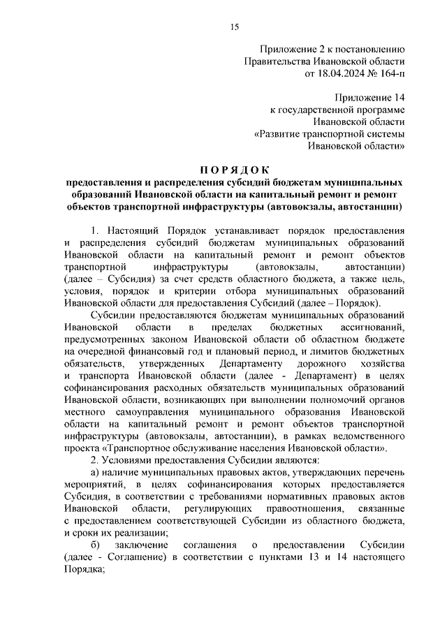 Постановление Правительства Ивановской области от 18.04.2024 N 164-п "О внесении изменений в постановление Правительства Ивановской области от 13.11.2013 N 447-п "Об утверждении государственной программы Ивановской области "Развитие транспортной системы Ивановской области" (вместе с "Порядком предоставления и распределения субсидий бюджетам муниципальных образований Ивановской области на приобретение транспортных средств автомобильного транспорта для регулярной перевозки пассажиров и багажа в границах муниципального образования", "Порядком предоставления и распределения субсидий бюджетам муниципальных образований Ивановской области на капитальный ремонт и ремонт объектов транспортной инфраструктуры (автовокзалы, автостанции)")