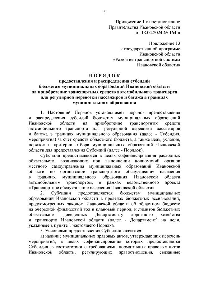 Постановление Правительства Ивановской области от 18.04.2024 N 164-п "О внесении изменений в постановление Правительства Ивановской области от 13.11.2013 N 447-п "Об утверждении государственной программы Ивановской области "Развитие транспортной системы Ивановской области" (вместе с "Порядком предоставления и распределения субсидий бюджетам муниципальных образований Ивановской области на приобретение транспортных средств автомобильного транспорта для регулярной перевозки пассажиров и багажа в границах муниципального образования", "Порядком предоставления и распределения субсидий бюджетам муниципальных образований Ивановской области на капитальный ремонт и ремонт объектов транспортной инфраструктуры (автовокзалы, автостанции)")