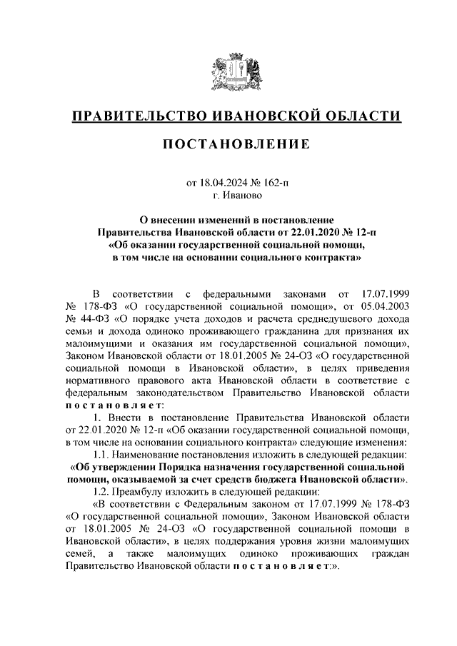 Постановление Правительства Ивановской области от 18.04.2024 N 162-п "О внесении изменений в постановление Правительства Ивановской области от 22.01.2020 N 12-п "Об оказании государственной социальной помощи, в том числе на основании социального контракта"
