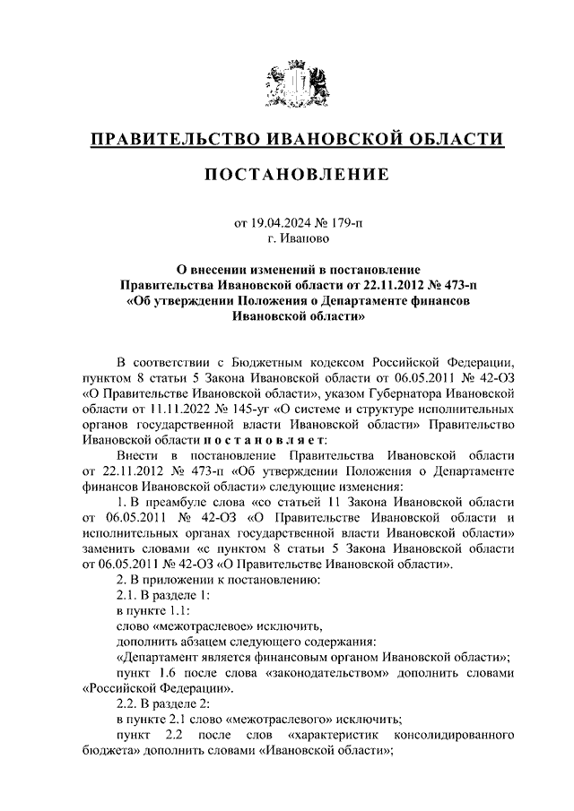 Постановление Правительства Ивановской области от 19.04.2024 N 179-п "О внесении изменений в постановление Правительства Ивановской области от 22.11.2012 N 473-п "Об утверждении Положения о Департаменте финансов Ивановской области"