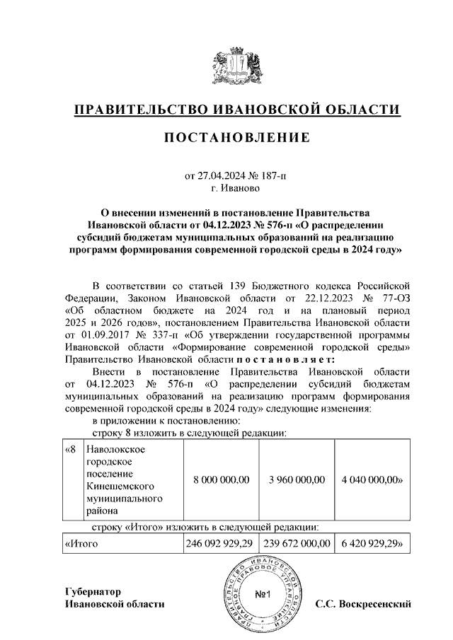 Постановление Правительства Ивановской области от 27.04.2024 N 187-п "О внесении изменений в постановление Правительства Ивановской области от 04.12.2023 N 576-п "О распределении субсидий бюджетам муниципальных образований на реализацию программ формирования современной городской среды в 2024 году"