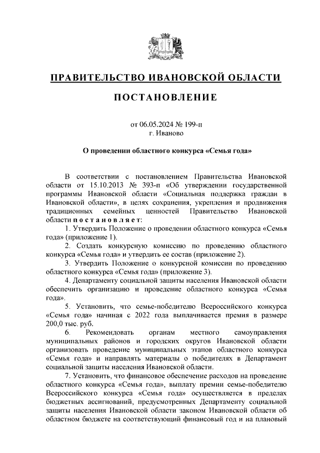 Постановление Правительства Ивановской области от 06.05.2024 N 199-п "О проведении областного конкурса "Семья года" (вместе с "Положением о проведении областного конкурса "Семья года", "Положением о конкурсной комиссии по проведению областного конкурса "Семья года")
