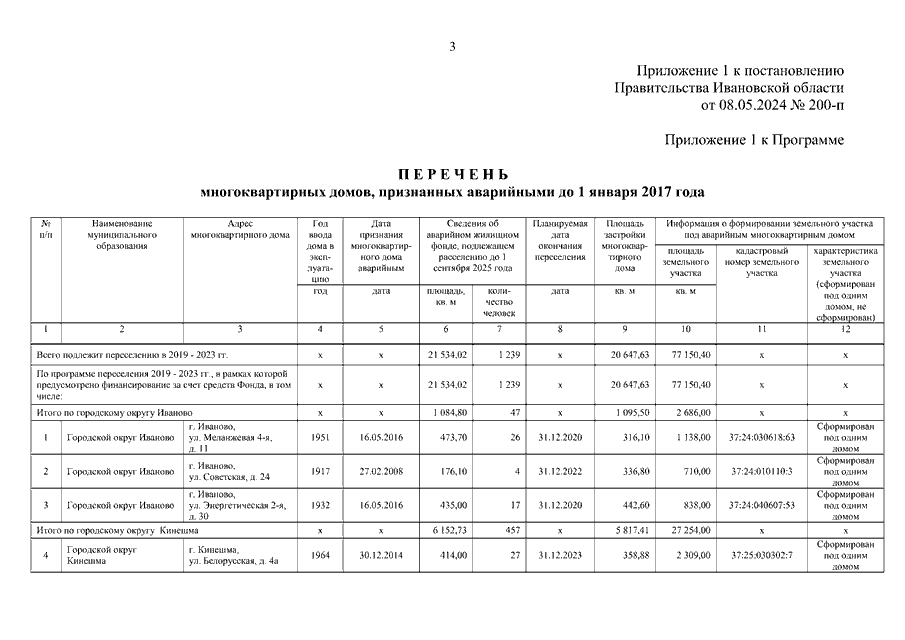 Постановление Правительства Ивановской области от 08.05.2024 N 200-п "О внесении изменений в постановление Правительства Ивановской области от 09.04.2019 N 131-п "Об утверждении региональной адресной программы "Переселение граждан из аварийного жилищного фонда на территории Ивановской области на 2019 - 2024 годы" (вместе с "Перечнем многоквартирных домов, признанных аварийными до 1 января 2017 года", "Планом реализации мероприятий по переселению граждан из аварийного жилищного фонда, признанного таковым до 1 января 2017 года, по способам переселения")