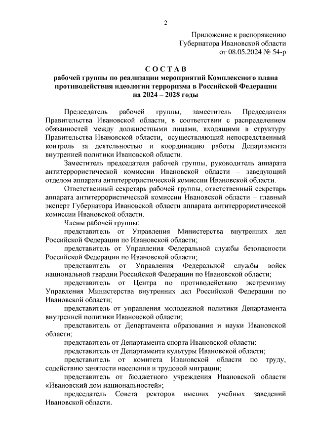Распоряжение Губернатора Ивановской области от 08.05.2024 N 54-р "О создании рабочей группы по реализации мероприятий Комплексного плана противодействия идеологии терроризма в Российской Федерации на 2024 - 2028 годы"