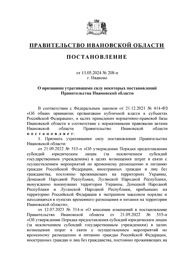 Постановление Правительства Ивановской области от 13.05.2024 N 208-п "О признании утратившими силу некоторых постановлений Правительства Ивановской области"