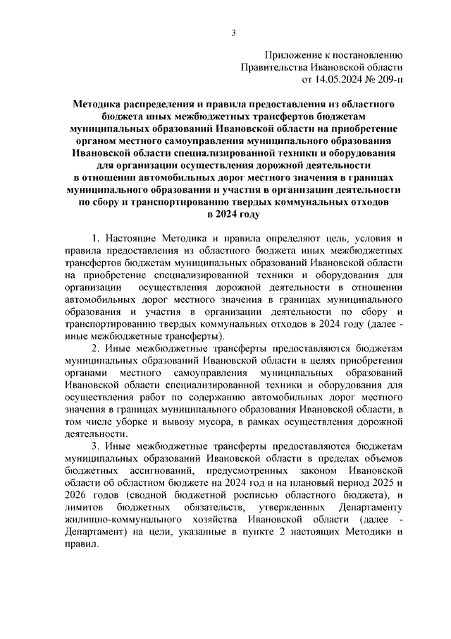 Постановление Правительства Ивановской области от 14.05.2024 N 209-п "Об утверждении Методики распределения и правил предоставления из областного бюджета иных межбюджетных трансфертов бюджетам муниципальных образований Ивановской области на приобретение специализированной техники и оборудования для организации осуществления дорожной деятельности в отношении автомобильных дорог местного значения в границах муниципального образования и участия в организации деятельности по сбору и транспортированию твердых коммунальных отходов в 2024 году" (вместе с "Методикой распределения и правилами предоставления из областного бюджета иных межбюджетных трансфертов бюджетам муниципальных образований Ивановской области на приобретение органом местного самоуправления муниципального образования Ивановской области специализированной техники и оборудования для организации осуществления дорожной деятельности в отношении автомобильных дорог местного значения в границах муниципального образования и участия в организации деятельности по сбору и транспортированию твердых коммунальных отходов в 2024 году")