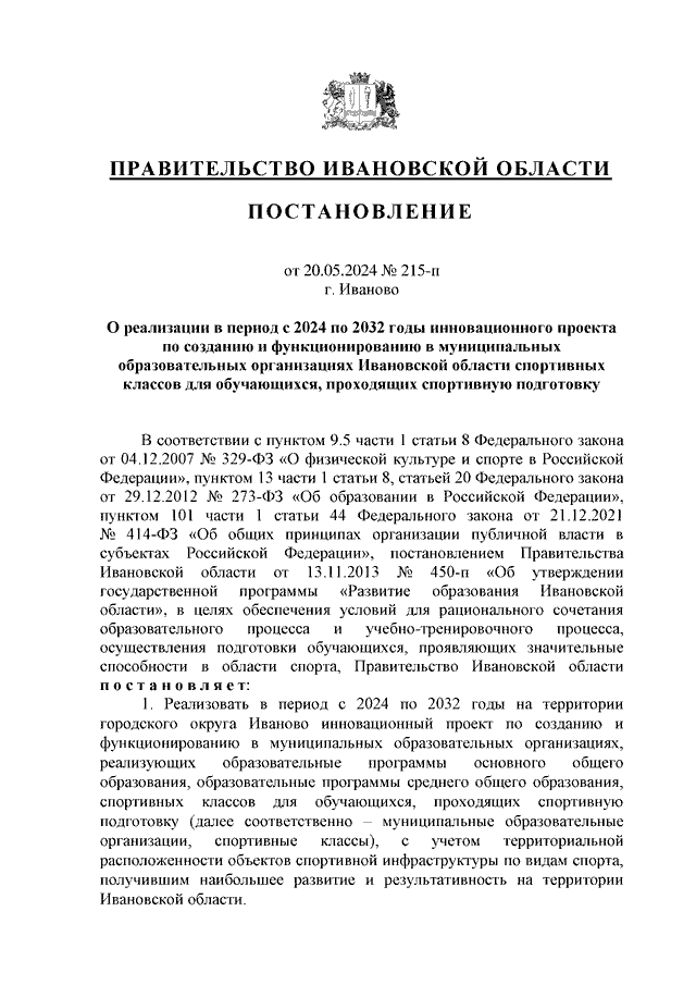 Постановление Правительства Ивановской области от 20.05.2024 N 215-п "О реализации в период с 2024 по 2032 годы инновационного проекта по созданию и функционированию в муниципальных образовательных организациях Ивановской области спортивных классов для обучающихся, проходящих спортивную подготовку"