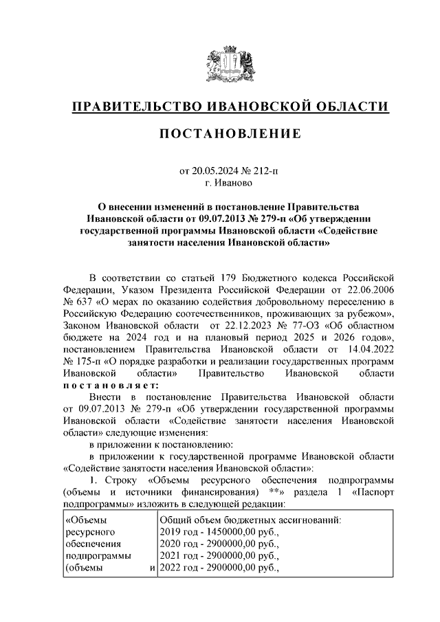 Постановление Правительства Ивановской области от 20.05.2024 N 212-п "О внесении изменений в постановление Правительства Ивановской области от 09.07.2013 N 279-п "Об утверждении государственной программы Ивановской области "Содействие занятости населения Ивановской области"