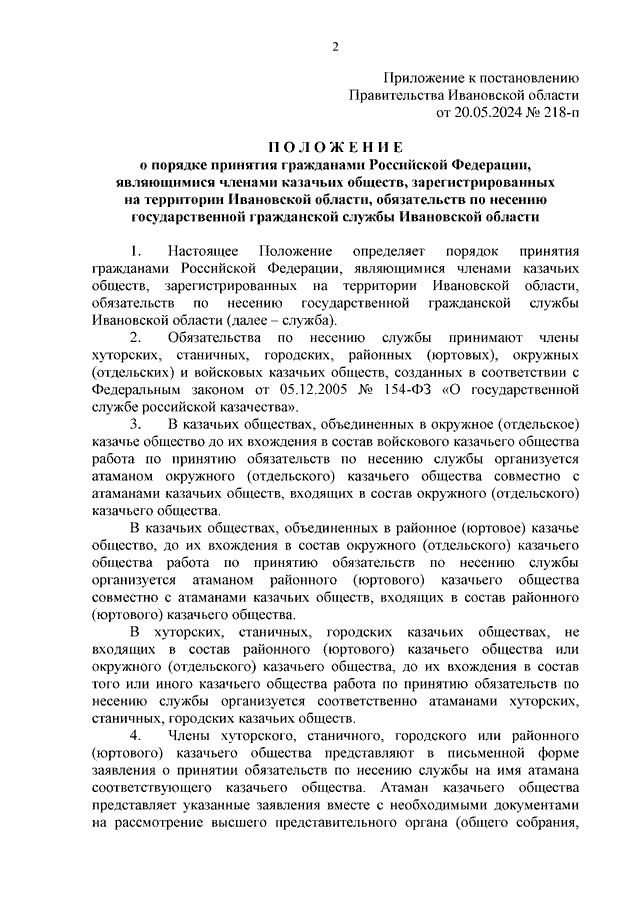 Постановление Правительства Ивановской области от 20.05.2024 N 218-п "Об утверждении Положения о порядке принятия гражданами Российской Федерации, являющимися членами казачьих обществ, зарегистрированных на территории Ивановской области, обязательств по несению государственной гражданской службы Ивановской области"