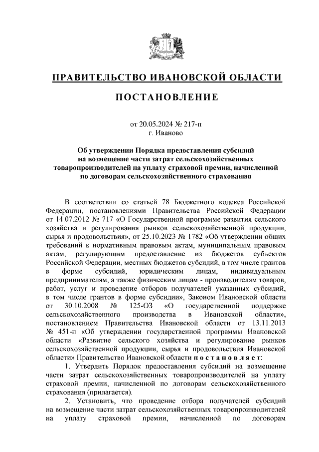 Постановление Правительства Ивановской области от 20.05.2024 N 217-п "Об утверждении Порядка предоставления субсидий на возмещение части затрат сельскохозяйственных товаропроизводителей на уплату страховой премии, начисленной по договорам сельскохозяйственного страхования"