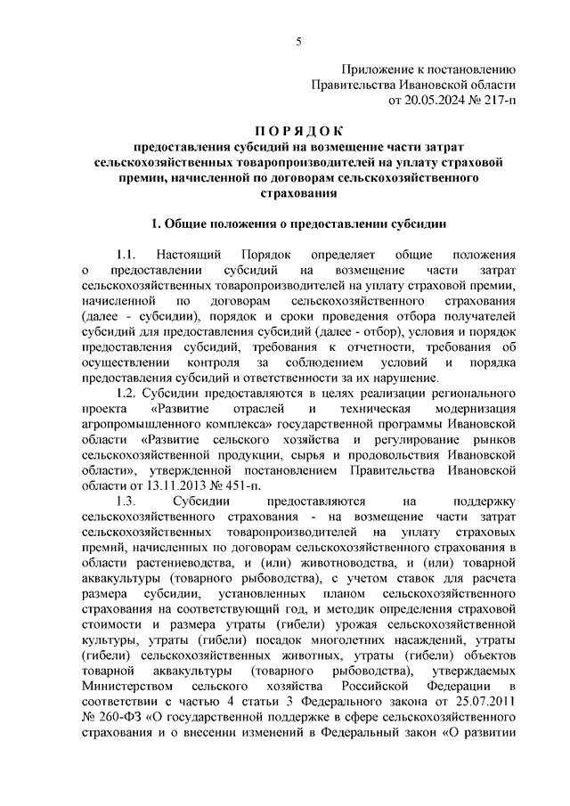 Постановление Правительства Ивановской области от 20.05.2024 N 217-п "Об утверждении Порядка предоставления субсидий на возмещение части затрат сельскохозяйственных товаропроизводителей на уплату страховой премии, начисленной по договорам сельскохозяйственного страхования"