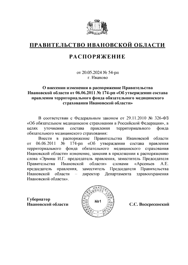Распоряжение Правительства Ивановской области от 20.05.2024 N 54-рп "О внесении изменения в распоряжение Правительства Ивановской области от 06.06.2011 N 174-рп "Об утверждении состава правления территориального фонда обязательного медицинского страхования Ивановской области"