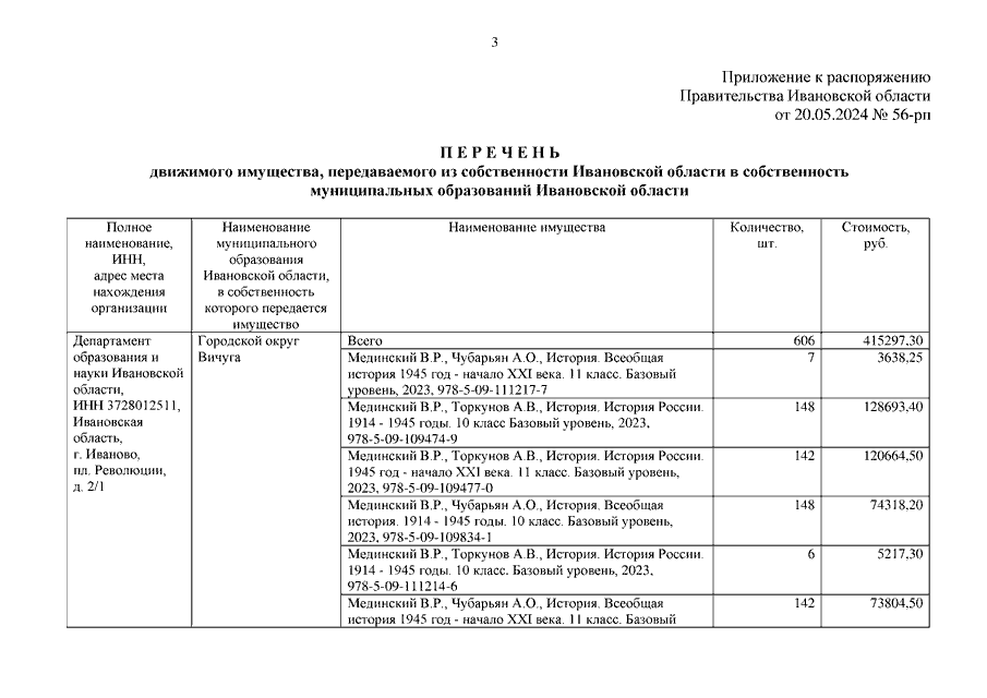 Распоряжение Правительства Ивановской области от 20.05.2024 N 56-рп "О передаче движимого имущества из собственности Ивановской области в собственность муниципальных образований Ивановской области"