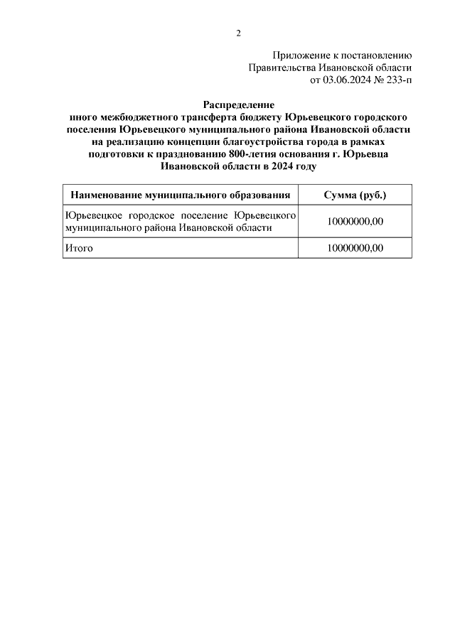 Постановление Правительства Ивановской области от 03.06.2024 N 233-п "Об утверждении распределения иного межбюджетного трансферта бюджету Юрьевецкого городского поселения Юрьевецкого муниципального района Ивановской области на реализацию концепции благоустройства города в рамках подготовки к празднованию 800-летия основания г. Юрьевца Ивановской области в 2024 году"