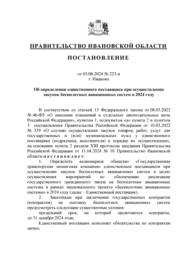 Постановление Правительства Ивановской области от 03.06.2024 N 223-п "Об определении единственного поставщика при осуществлении закупок беспилотных авиационных систем в 2024 году"
